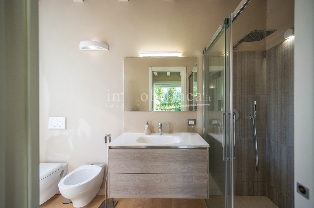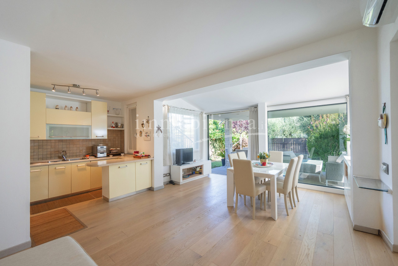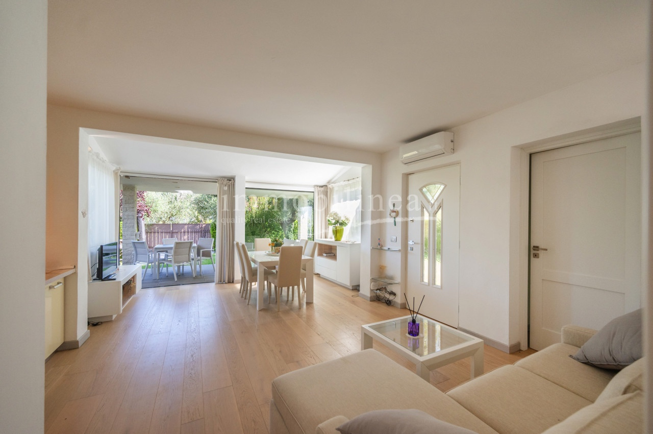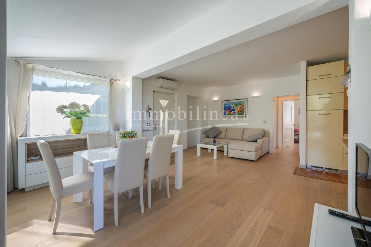 Die Villa bietet helle und gut gestaltete Räume mit großen Fenstern, die es natürliches Licht ermöglichen, jede Ecke des Hauses zu erhellen. Die Innenräume zeichnen sich durch moderne Oberflächen und hochwertige Materialien aus und schaffen eine einladende sowie raffinierte Atmosphäre.