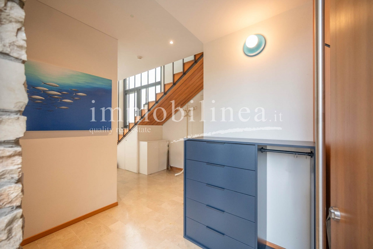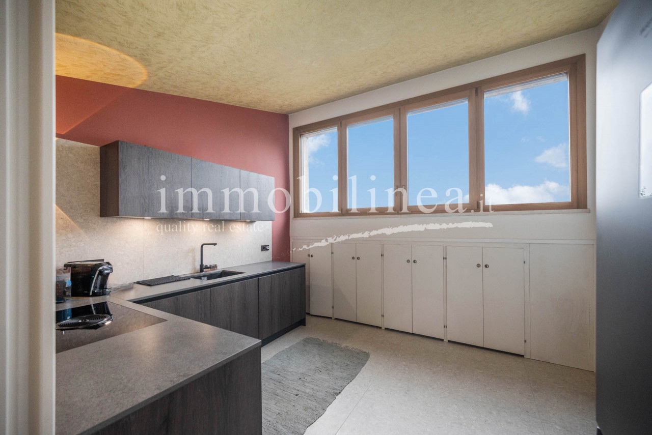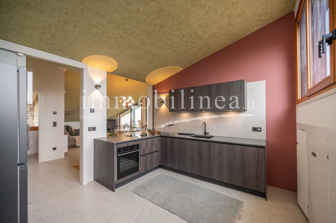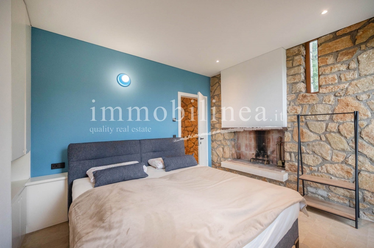 Ein privater Eingang führt in eine Oase der Ruhe, wo modernes Design und Natur aufeinandertreffen. Im Obergeschoss öffnet sich ein großzügiger Wohn- und Küchenbereich mit einem raumhohen Panoramafenster – der Blick auf den See und das malerische Dorf ist einfach überwältigend, wie ein Gemälde zum Leben erweckt.