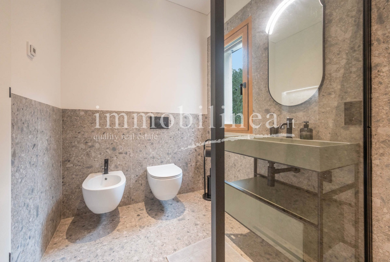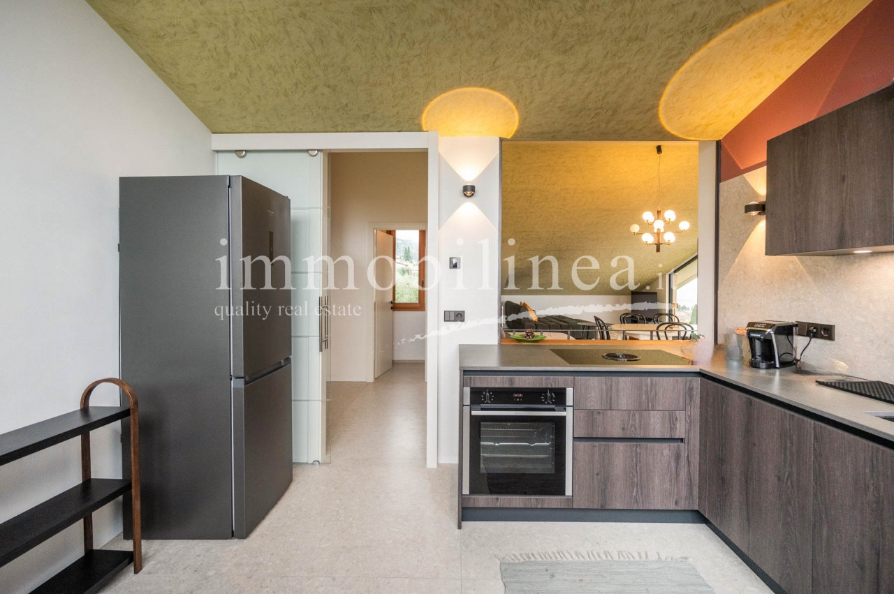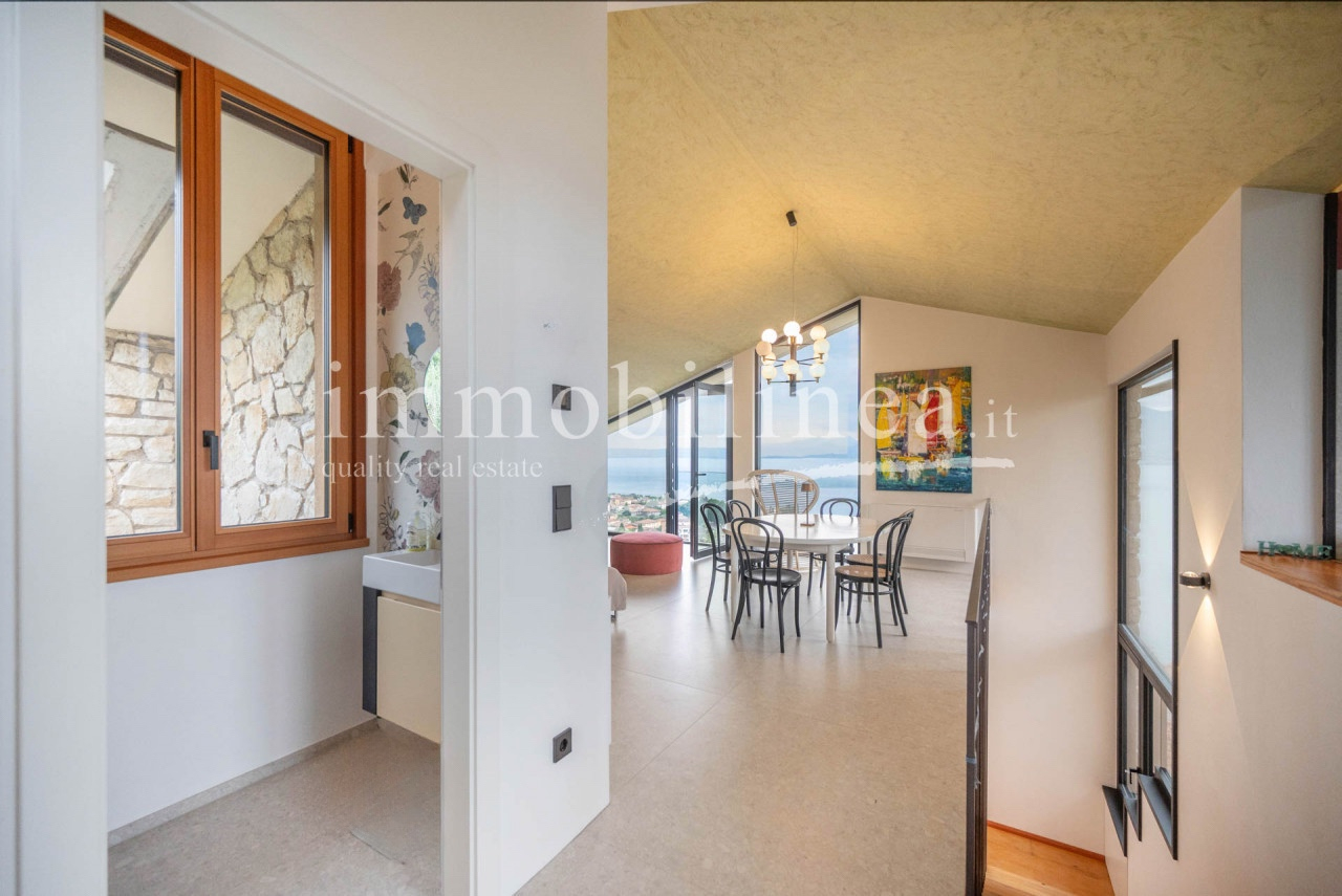 TORRI DEL BENACO - Nur 450 Meter vom Ufer entfernt, ruhig gelegen in den Hügeln über Torri del Benaco, präsentiert sich diese vollständig renovierte Immobilie (Energieklasse A3) als harmonisches Zusammenspiel von Privatsphäre, Eleganz und spektakulärem Ausblick.