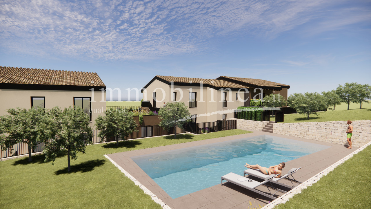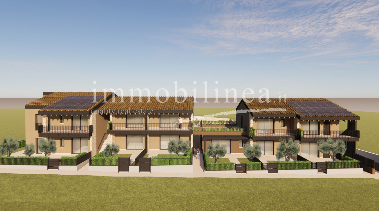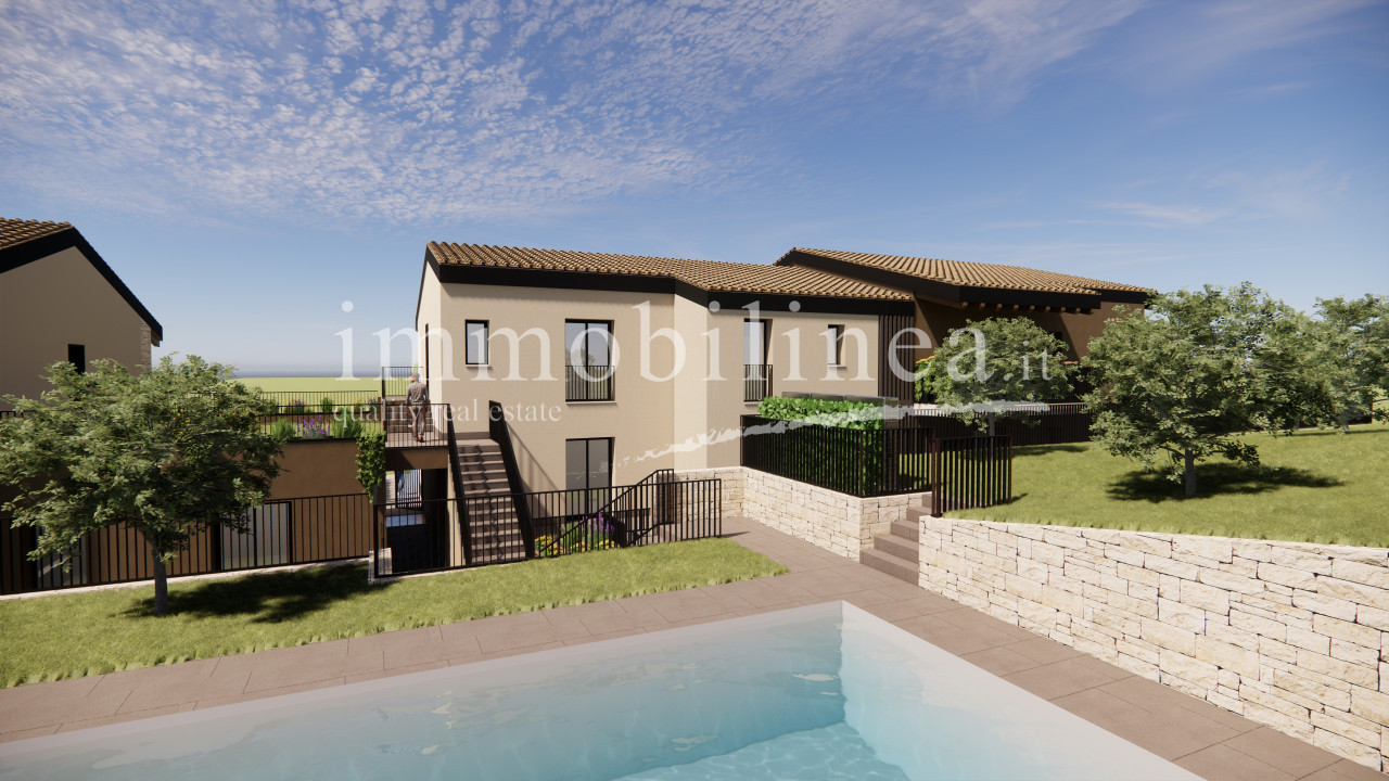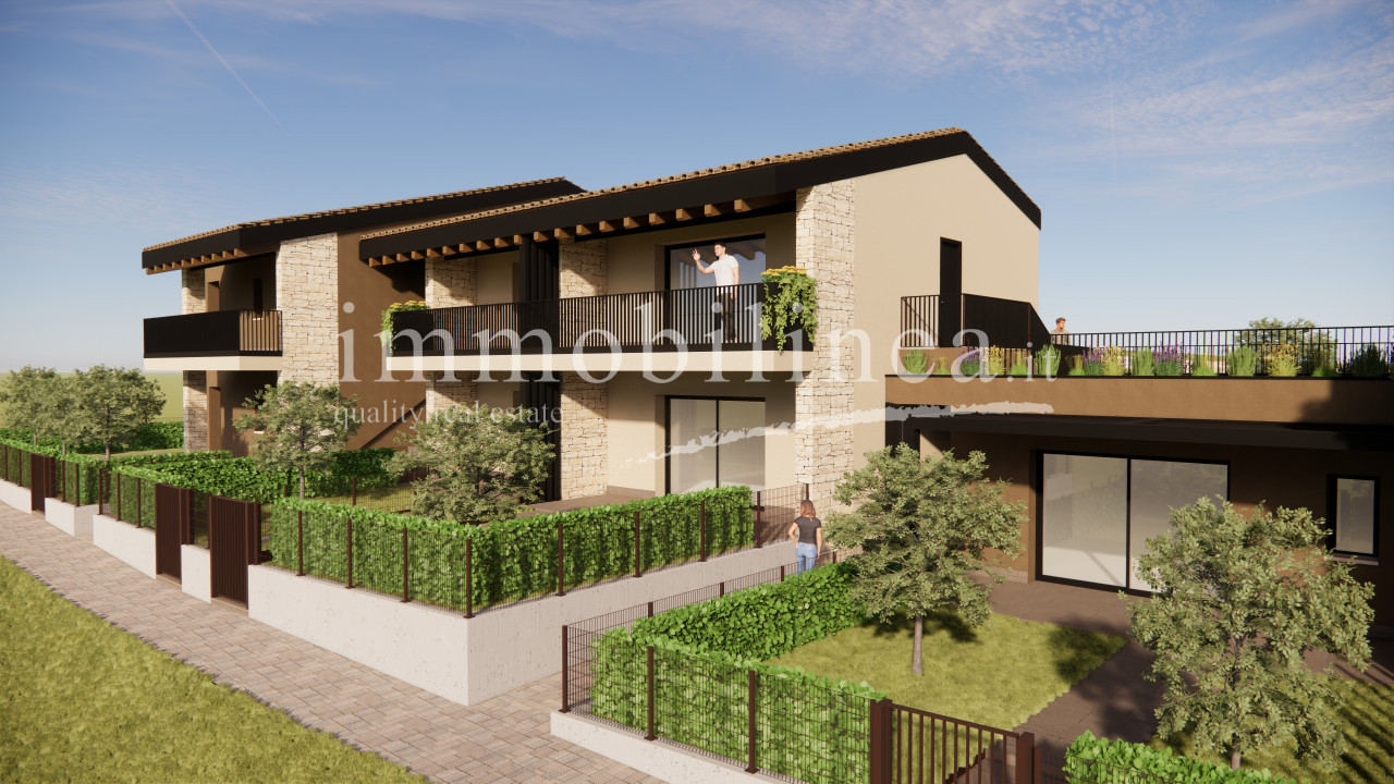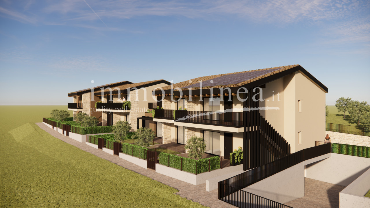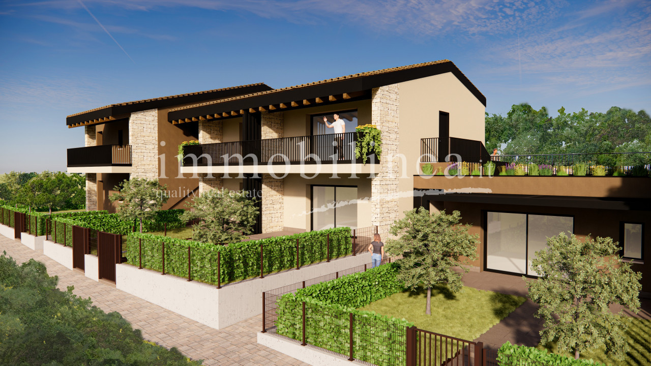 GARDA - Immobilinea is pleased to exclusively present the new Residence Cimabue! It will be located in a very close, elevated and tranquil position to the center, characterized by pleasant aesthetics and surrounded by greenery. The residence will consist of thirteen elegant apartments arranged on the ground floor or first floor. Eight three-room solutions will be available, featuring two bedrooms; five on the ground floor with private gardens and three on the first floor with spacious livable terraces. The complex, equipped with a beautiful communal swimming pool, will be built in Class A fully respecting environmental regulations and current standards, with all apartments designed thoughtfully regarding space and detail. They will be constructed using state-of-the-art building criteria while allowing buyers to choose their own finishes according to individual ideas. All units will come with garages in the basement, some of which are double-sized. High-quality construction combined with an exceptionally advantageous location!