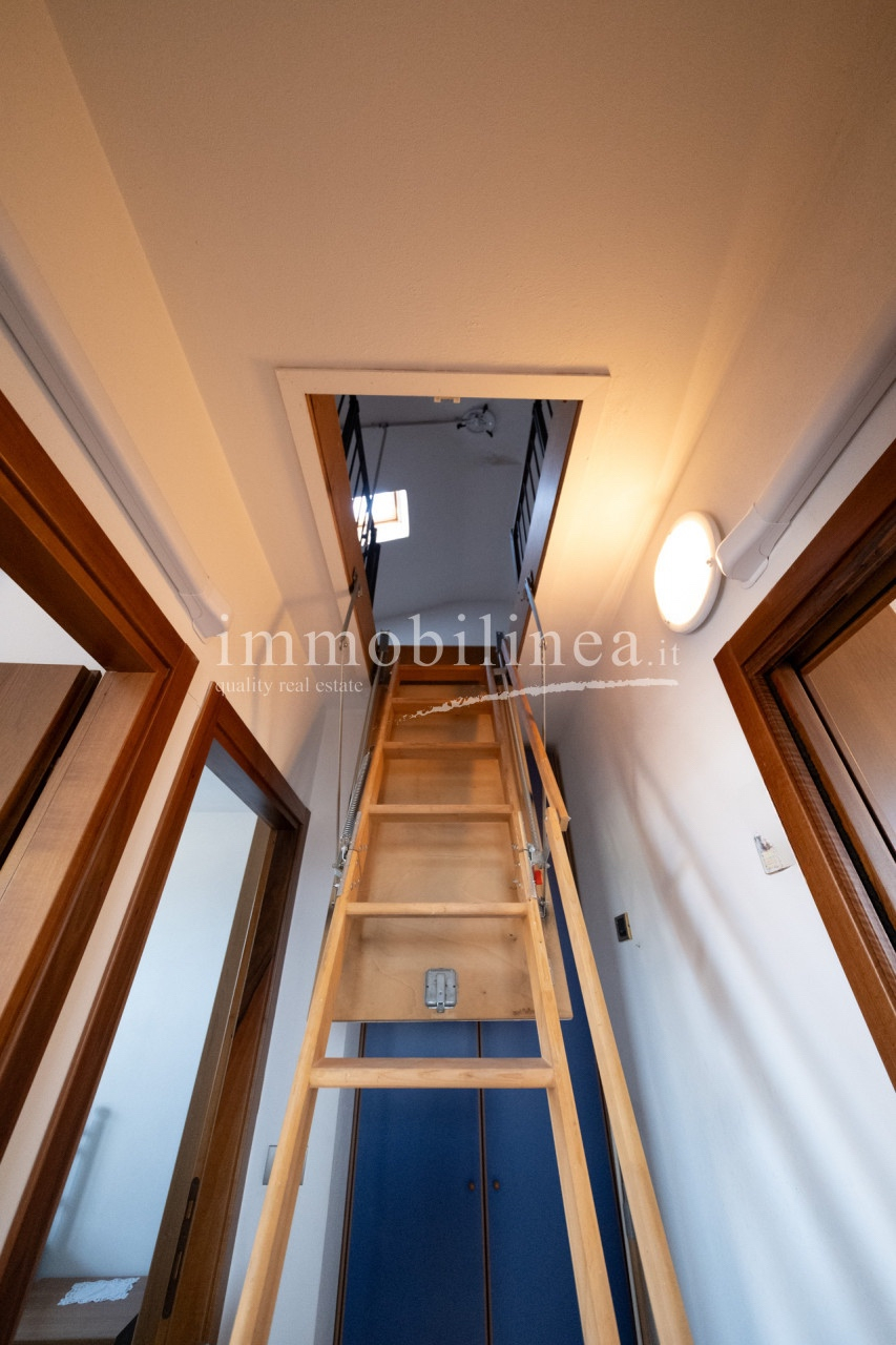 The apartment consists of a cozy living room with kitchenette, two bedrooms: the master bedroom and a second double room perfect for guests or family members. The windowed bathroom adds practicality to the unit while the hallway provides access to an attic via retractable stairs – an extra useful space for storage.