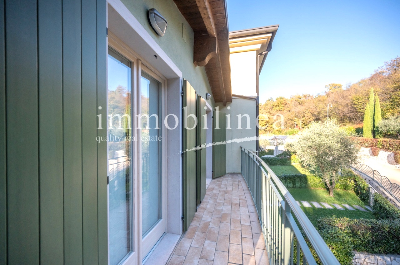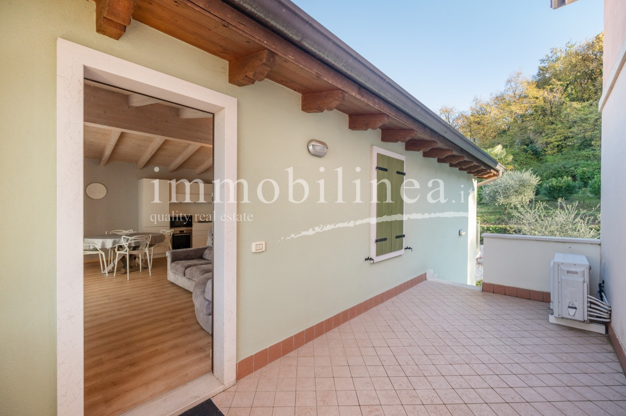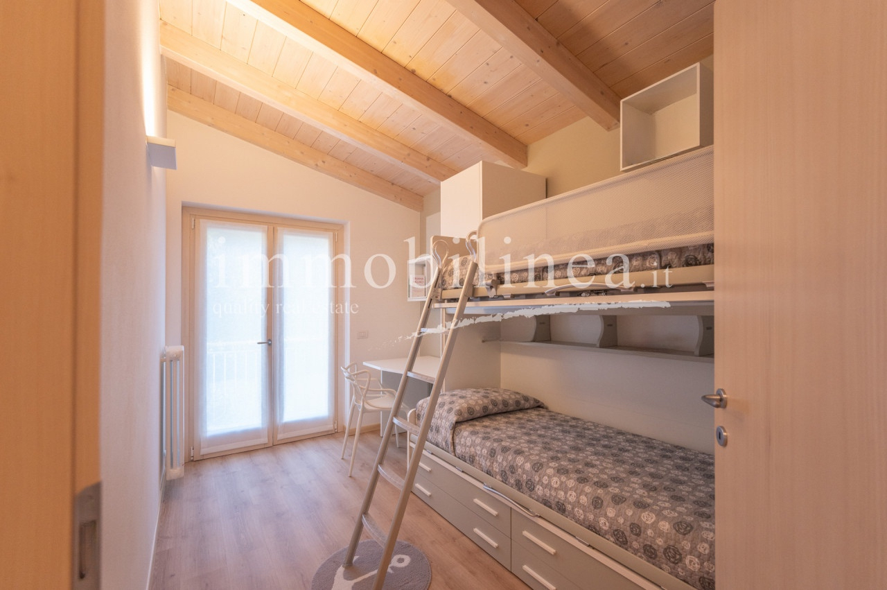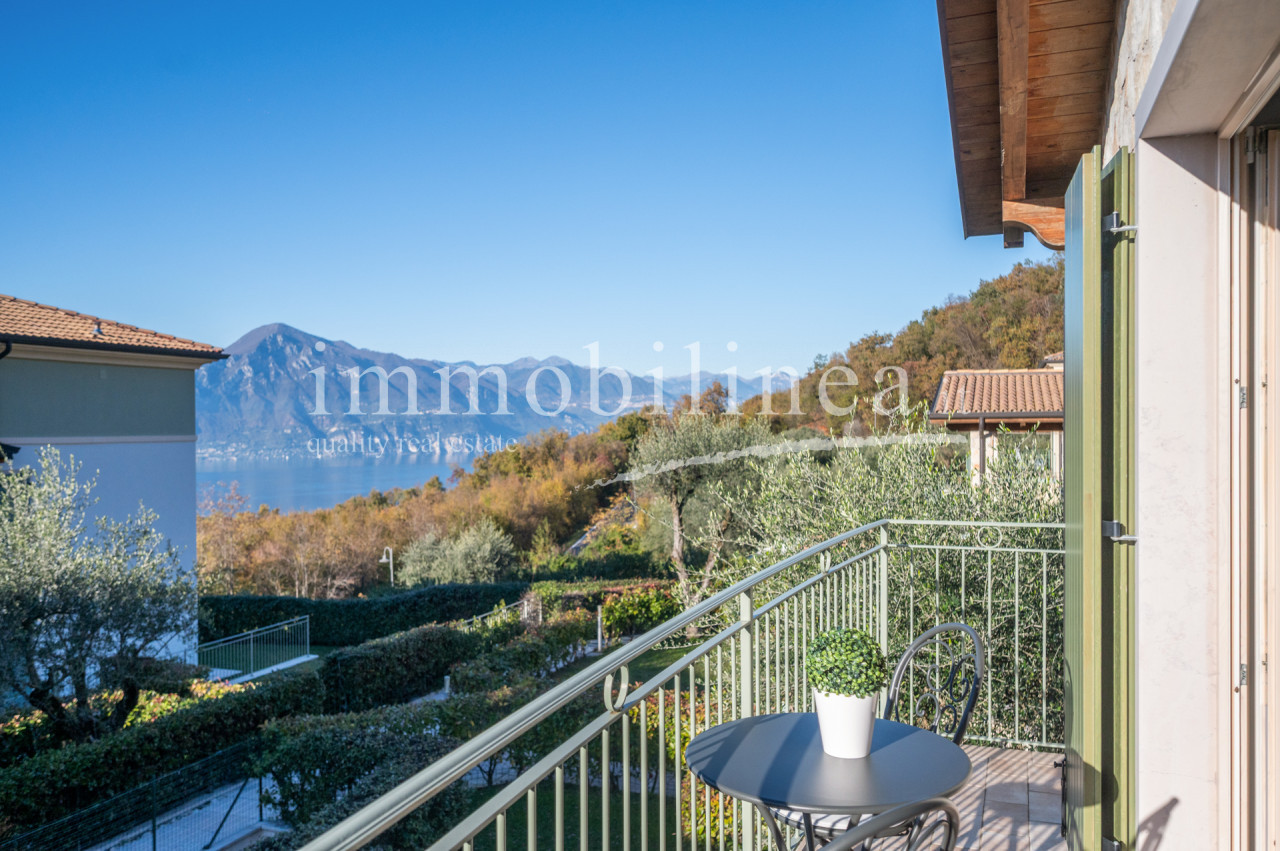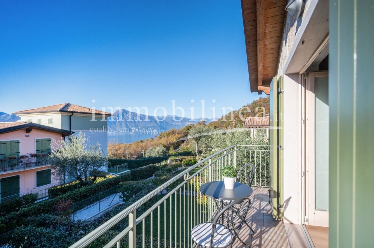 El apartamento cuenta con espacios amplios y luminosos: la zona de estar abierta se realza con un moderno techo con vigas vistas de madera natural, mientras que las grandes ventanas corredizas conectan directamente a la terraza habitable y al balcón frontal. Desde aquí se disfruta cada día de un espectacular panorama sobre el Lago de Garda y las montañas circundantes; el espacio exterior amueblado es ideal para relajarse o almorzar al aire libre rodeados por la naturaleza.