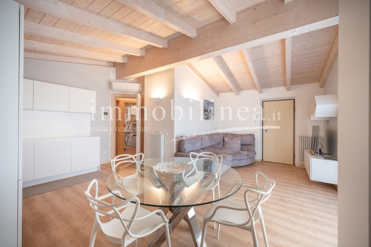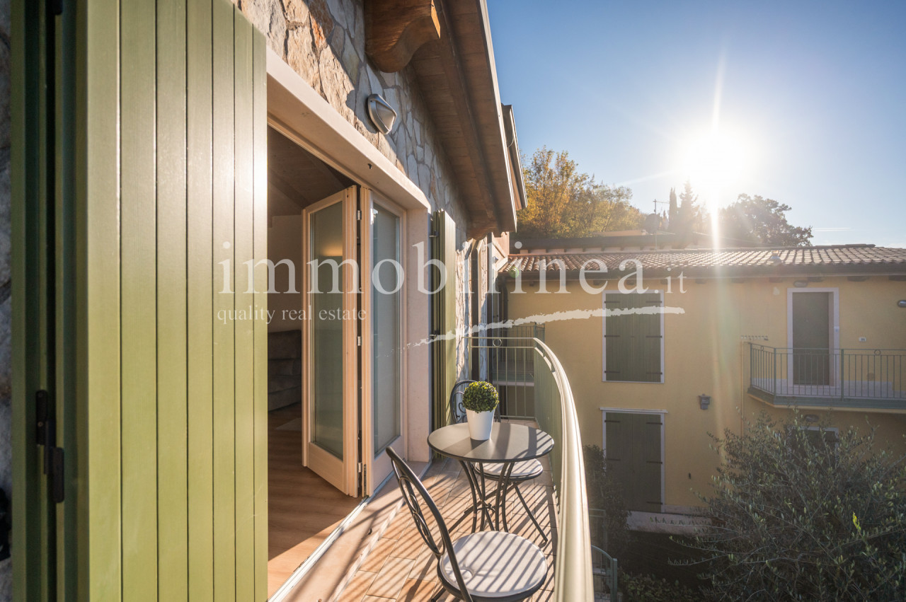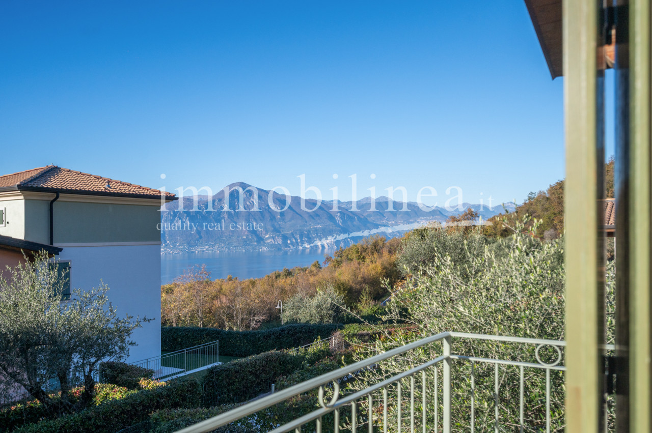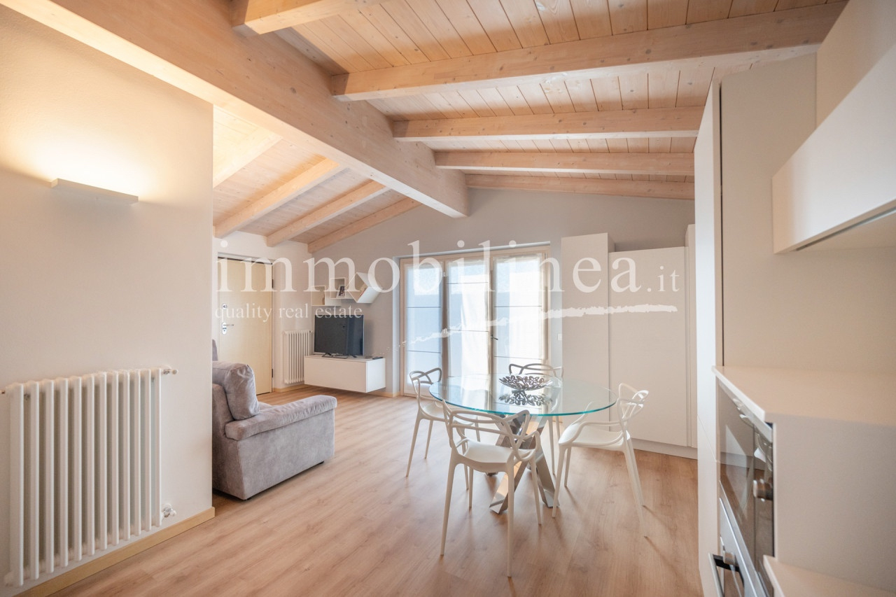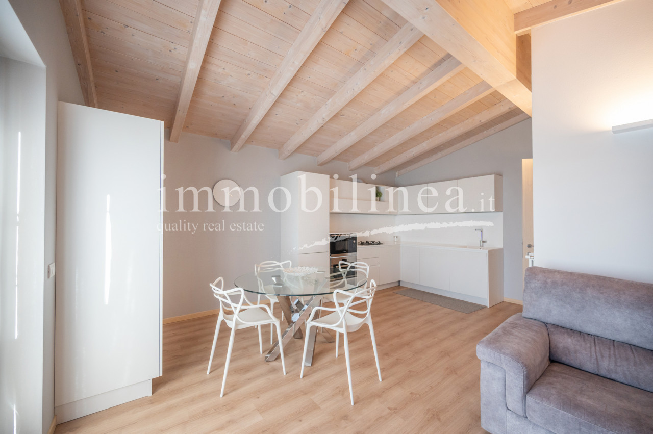 El apartamento cuenta con espacios amplios y luminosos: la zona de estar abierta se realza con un moderno techo con vigas vistas de madera natural, mientras que las grandes ventanas corredizas conectan directamente a la terraza habitable y al balcón frontal. Desde aquí se disfruta cada día de un espectacular panorama sobre el Lago de Garda y las montañas circundantes; el espacio exterior amueblado es ideal para relajarse o almorzar al aire libre rodeados por la naturaleza.