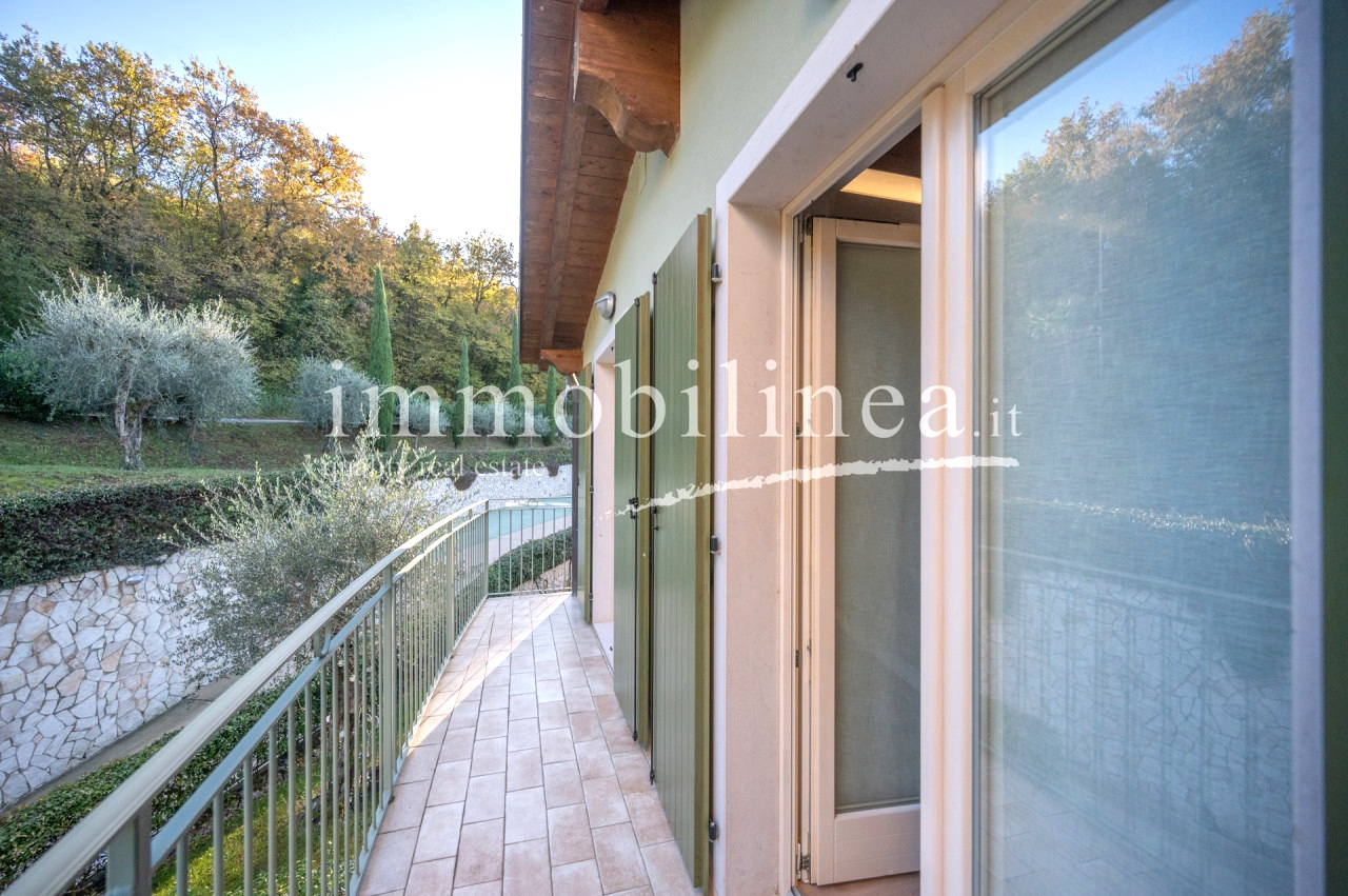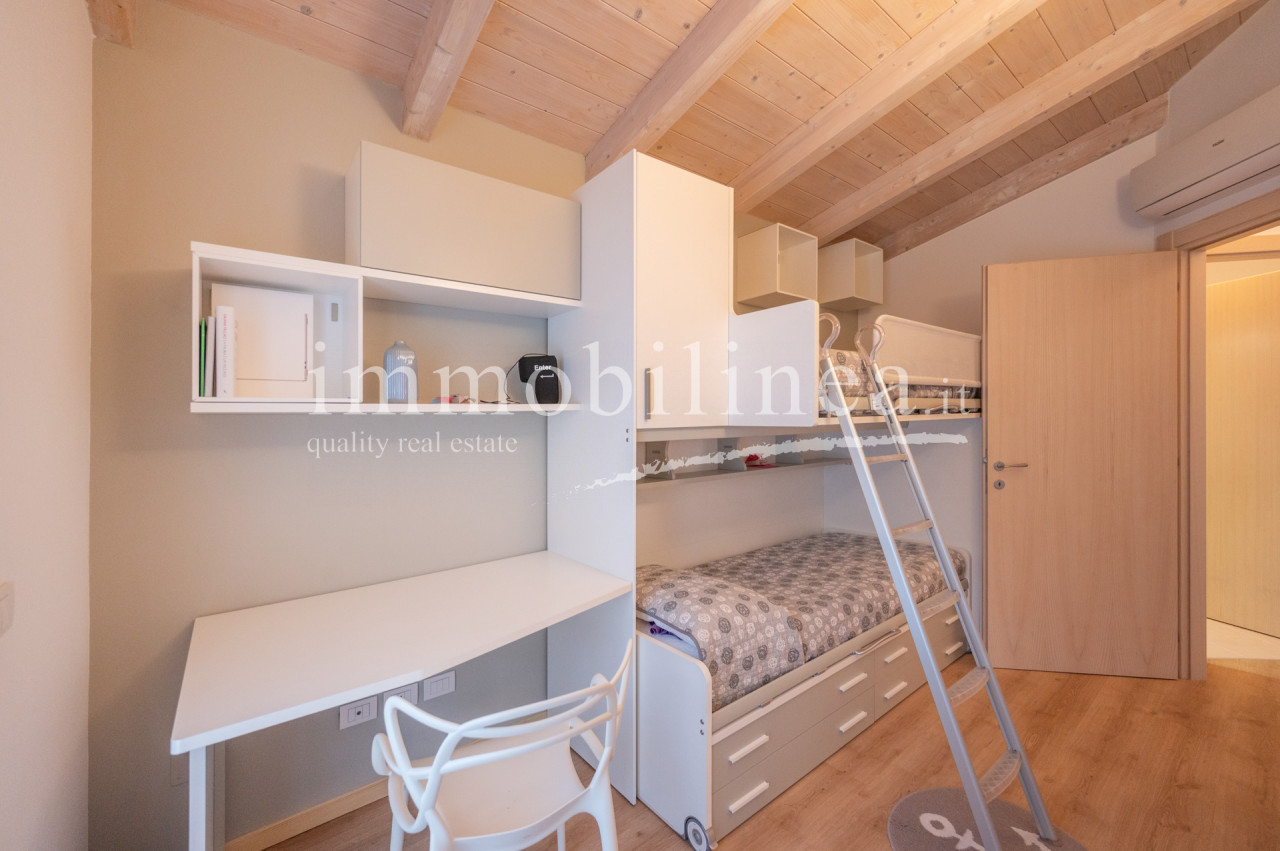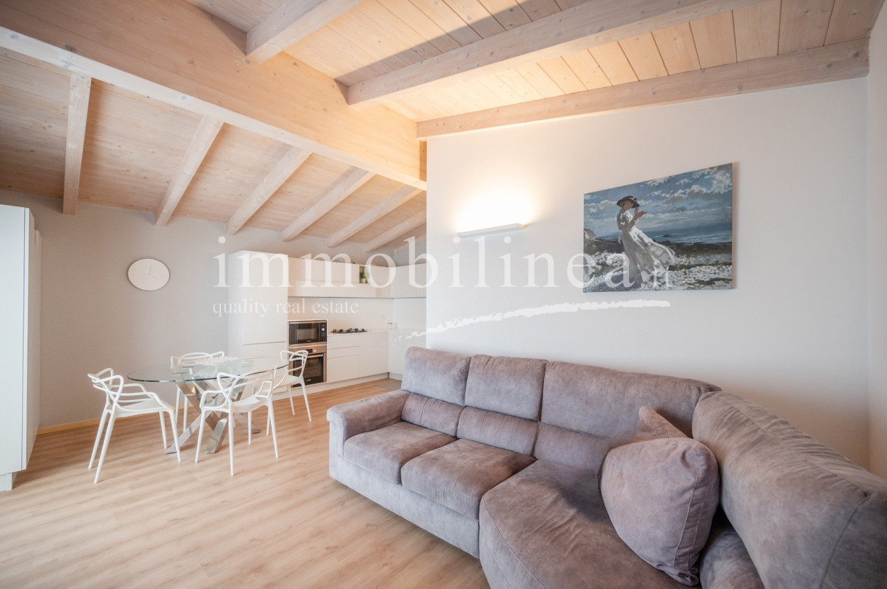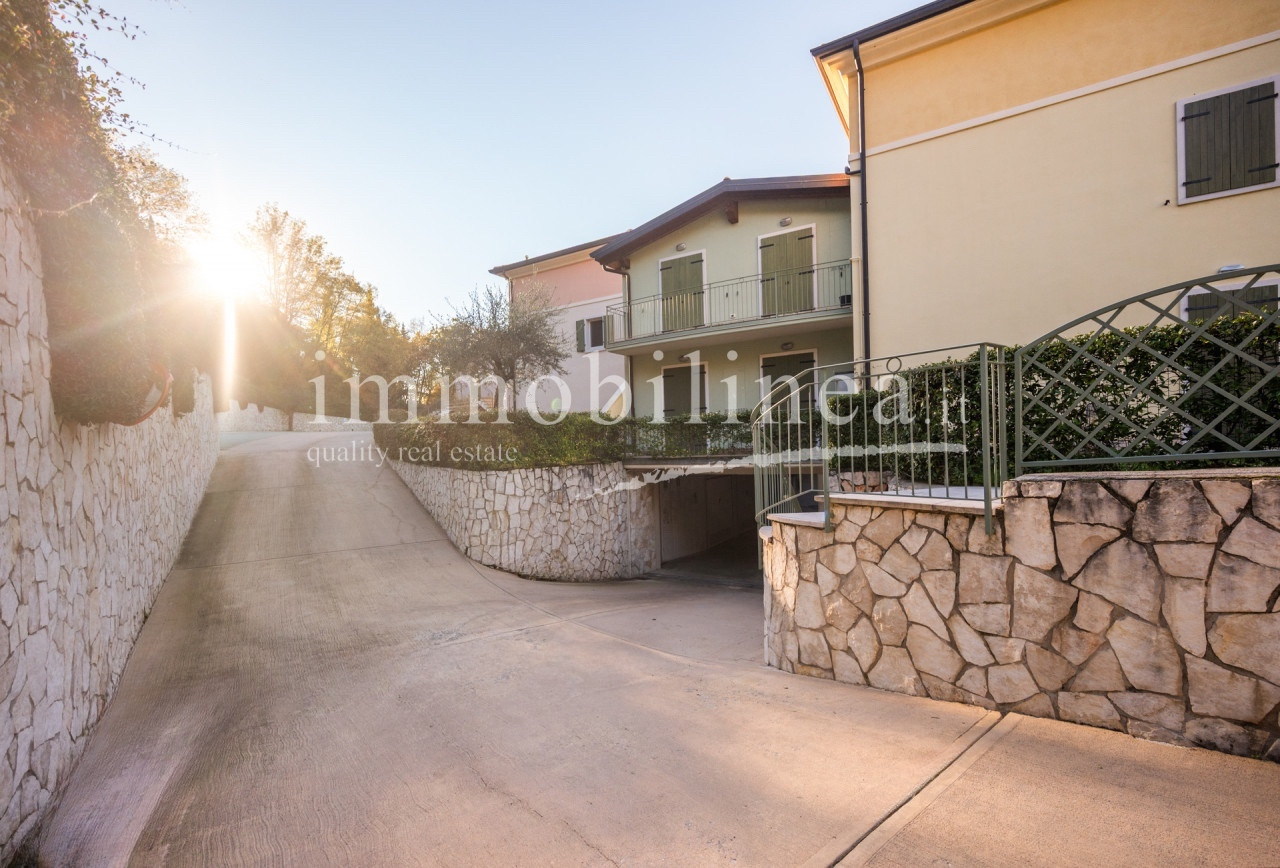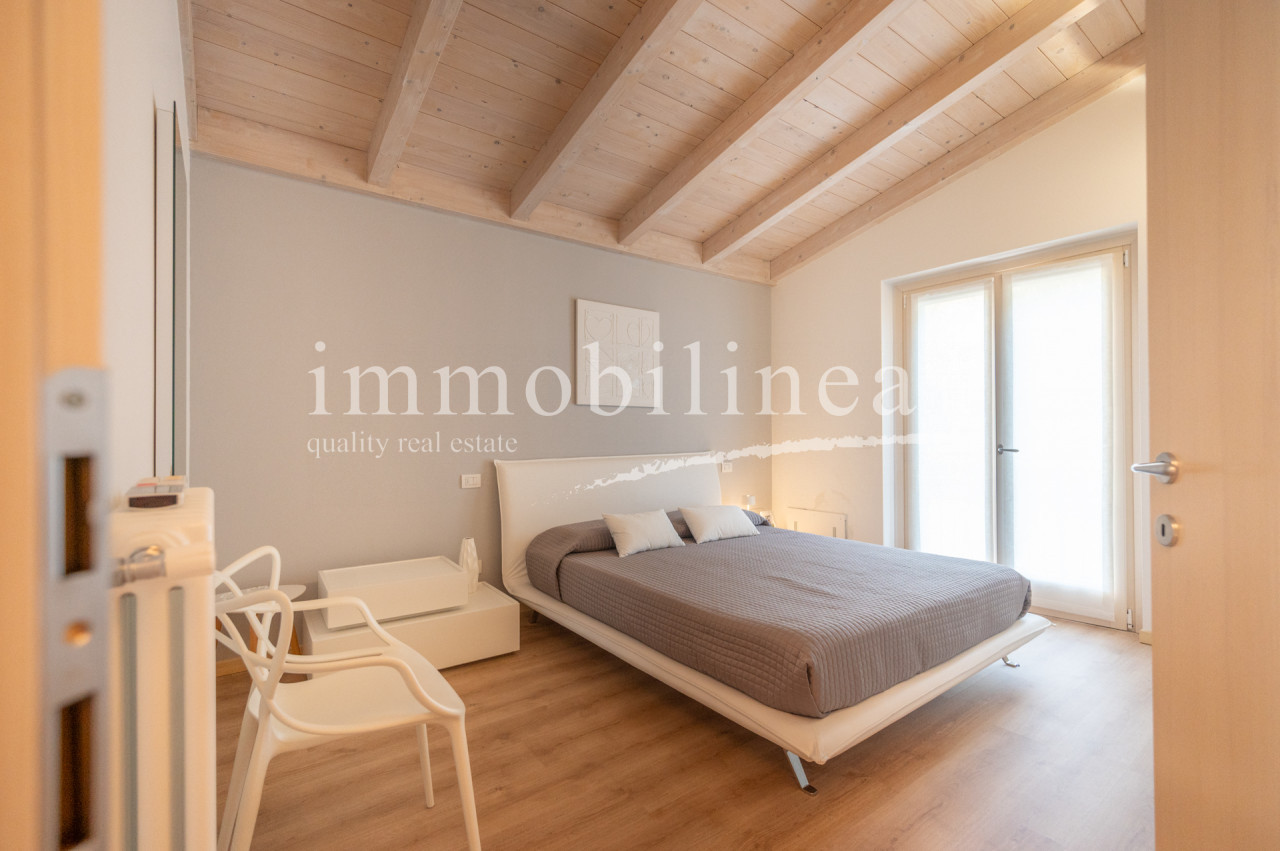 El apartamento cuenta con espacios amplios y luminosos: la zona de estar abierta se realza con un moderno techo con vigas vistas de madera natural, mientras que las grandes ventanas corredizas conectan directamente a la terraza habitable y al balcón frontal. Desde aquí se disfruta cada día de un espectacular panorama sobre el Lago de Garda y las montañas circundantes; el espacio exterior amueblado es ideal para relajarse o almorzar al aire libre rodeados por la naturaleza.