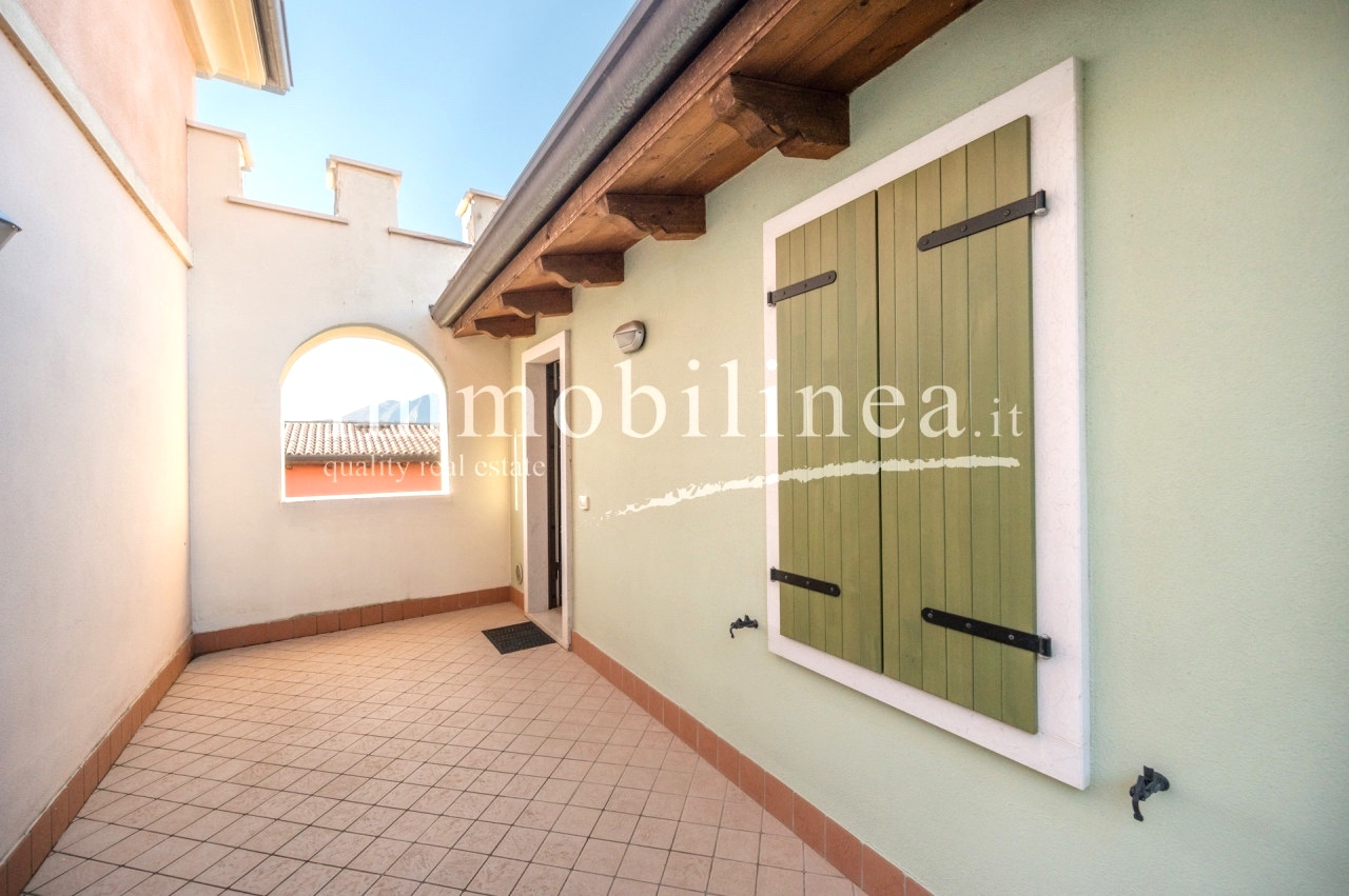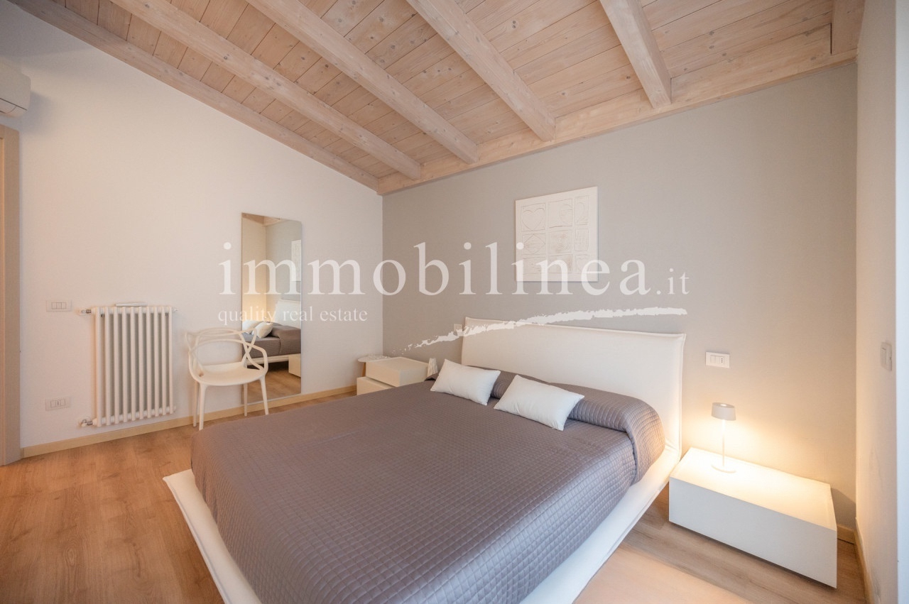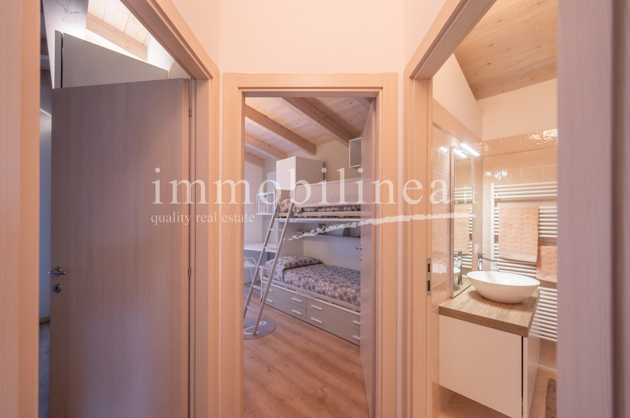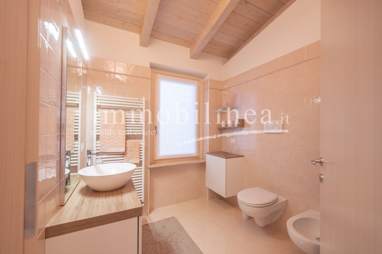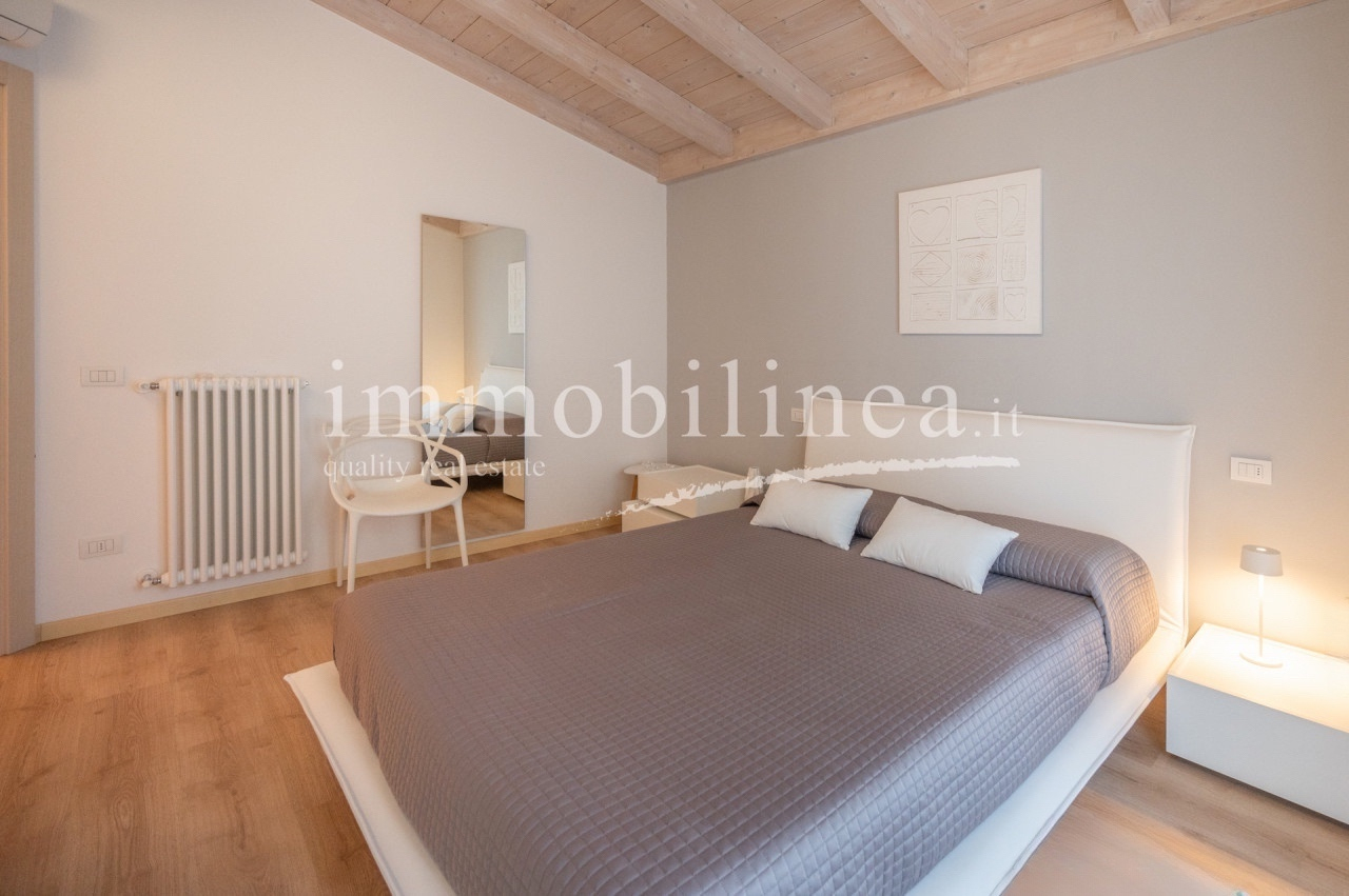 El apartamento cuenta con espacios amplios y luminosos: la zona de estar abierta se realza con un moderno techo con vigas vistas de madera natural, mientras que las grandes ventanas corredizas conectan directamente a la terraza habitable y al balcón frontal. Desde aquí se disfruta cada día de un espectacular panorama sobre el Lago de Garda y las montañas circundantes; el espacio exterior amueblado es ideal para relajarse o almorzar al aire libre rodeados por la naturaleza.