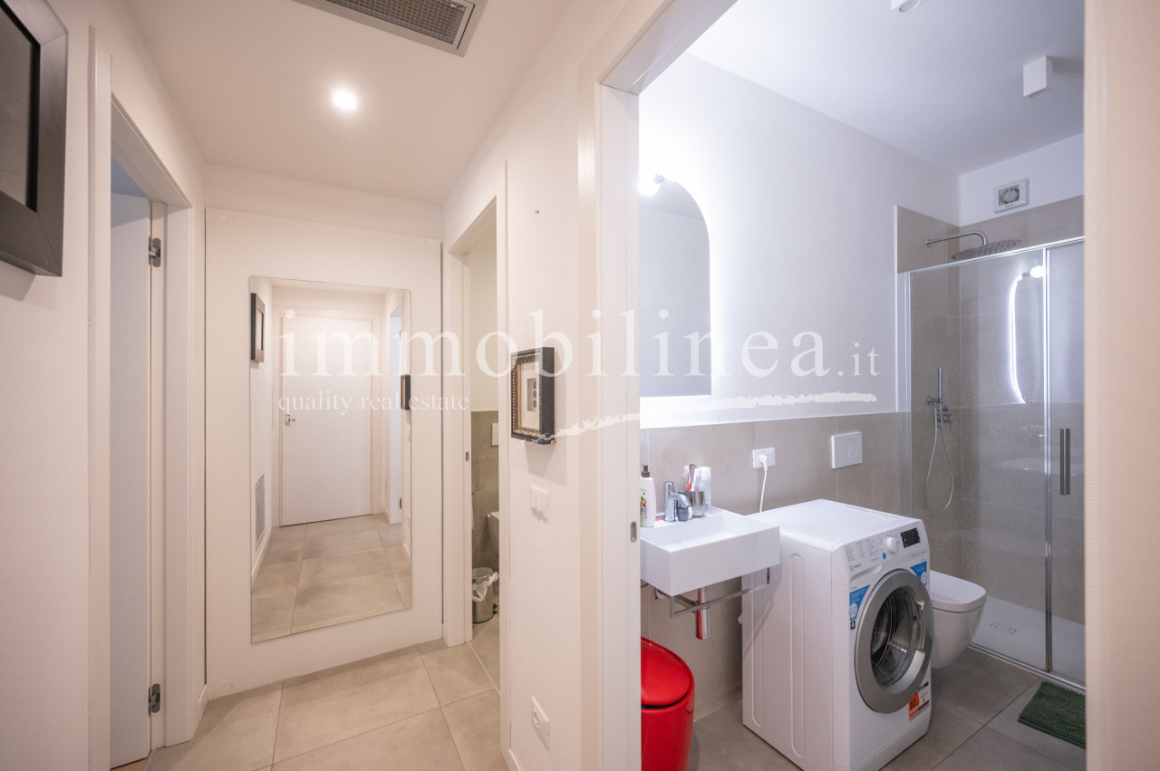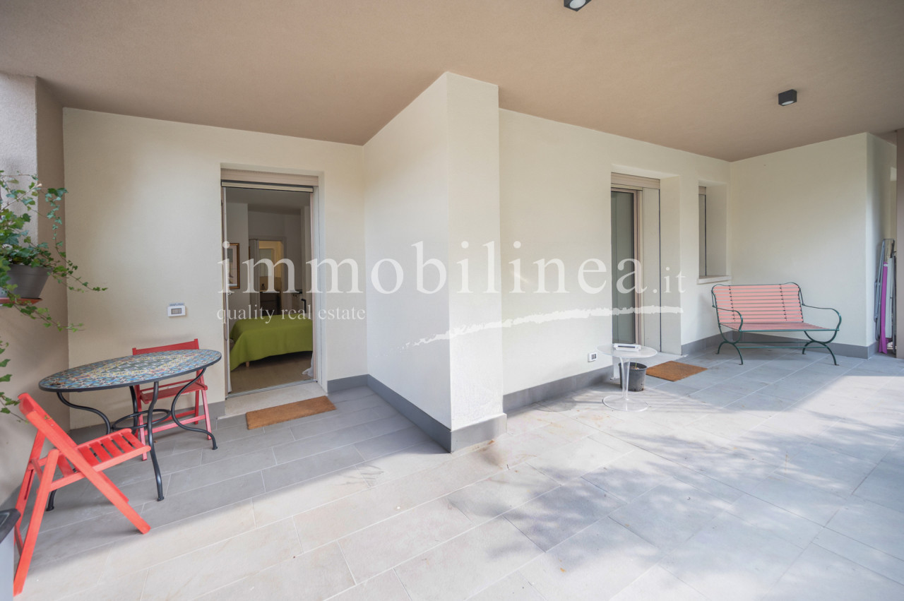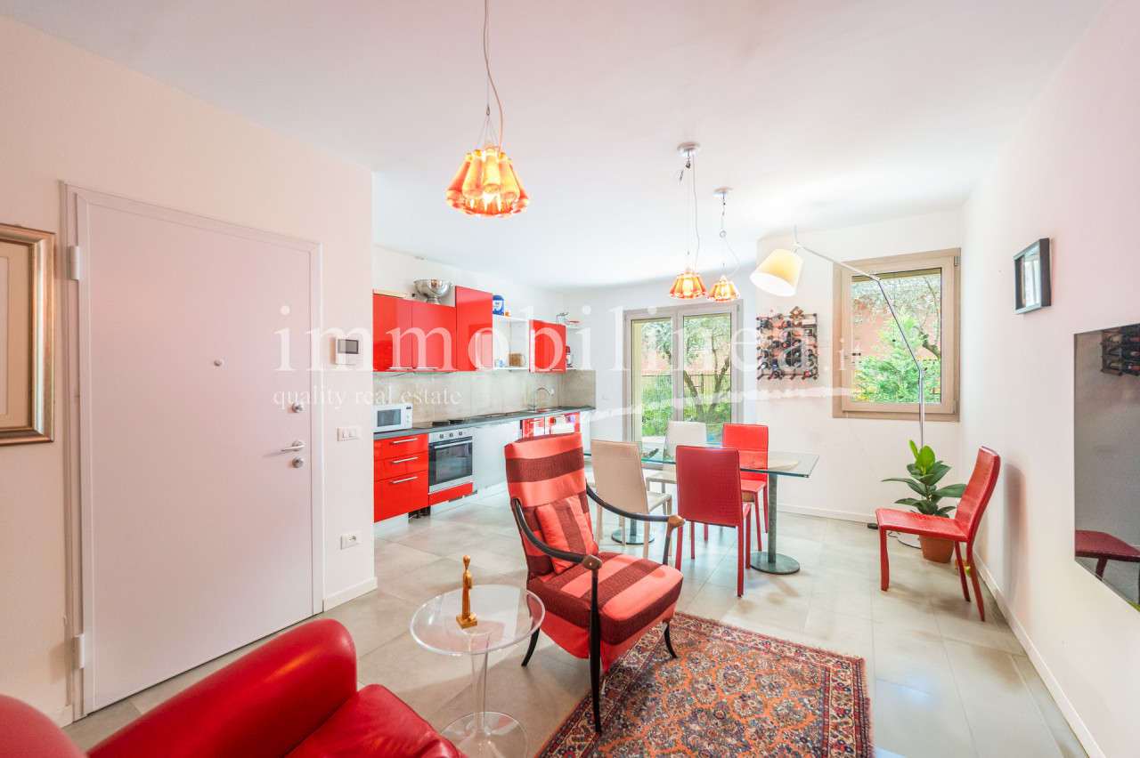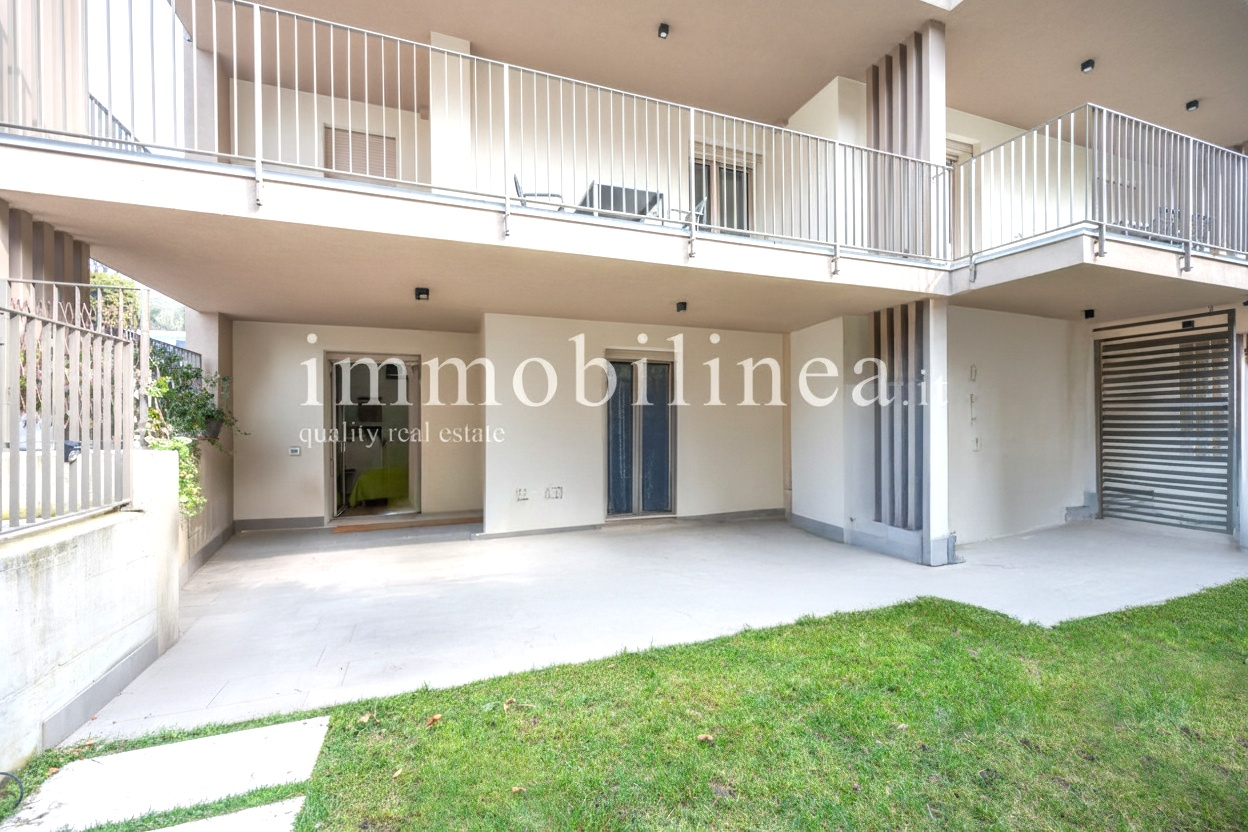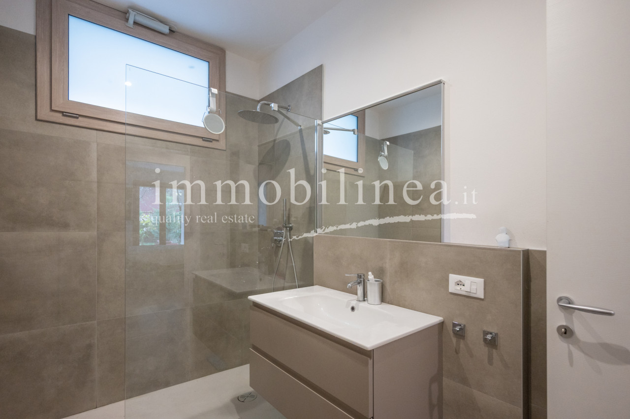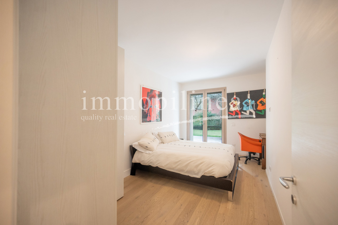 The apartment offers 85 square meters of living space and comprises three spacious bedrooms, three modern bathrooms, a large living room with kitchenette that opens onto a beautiful covered porch and perfectly maintained private garden. The energy class A4 ensures maximum savings thanks to the photovoltaic panels installed on the roof of the building.