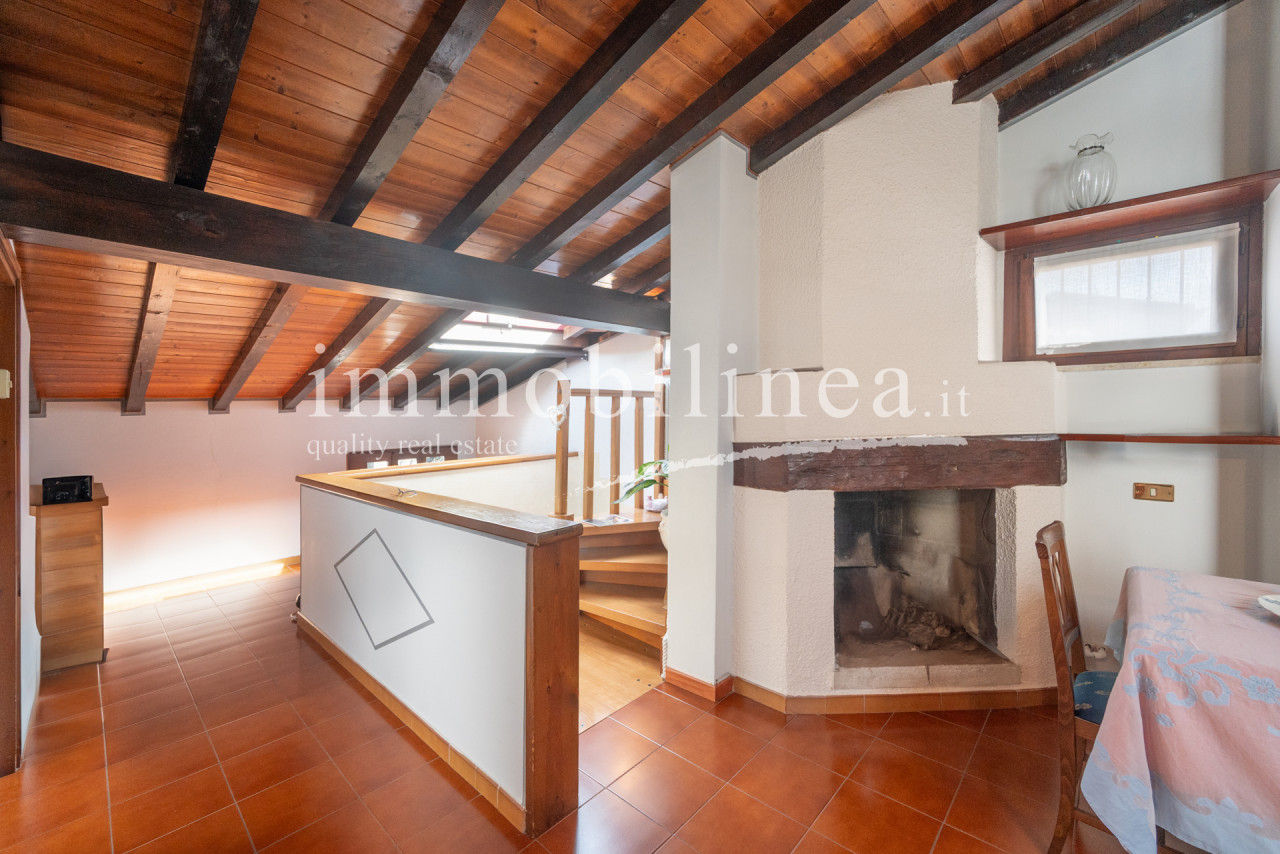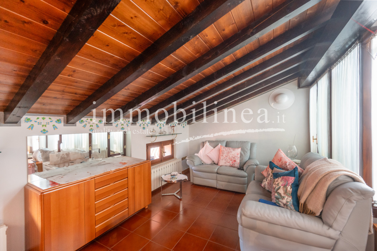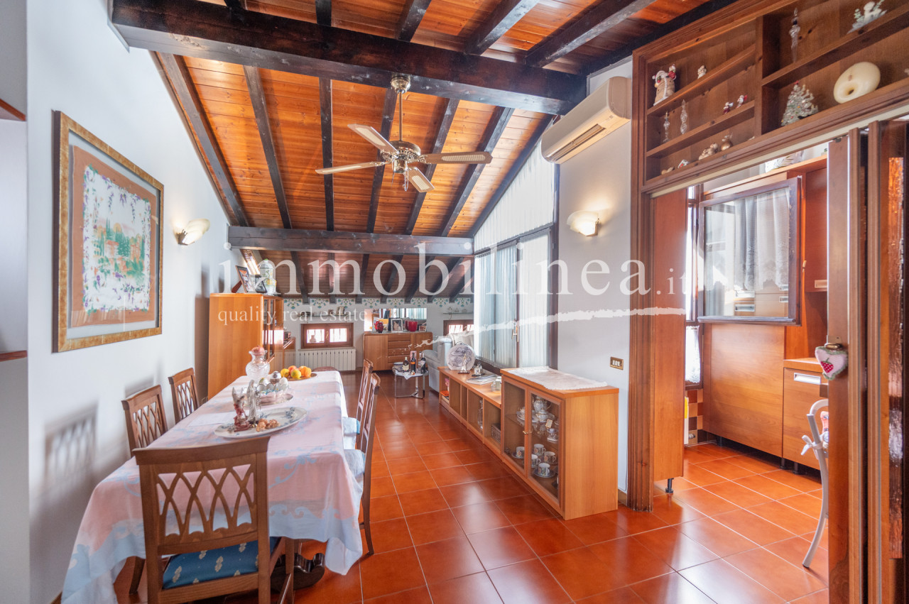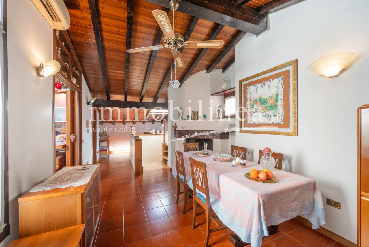 The living room immediately impresses with elegant dark wooden beams that add warmth to the open space; the living area is particularly spacious and welcoming, ideal for both convivial moments and family relaxation. The eat-in kitchen opens onto the dining room enriched by natural light coming from numerous windows.