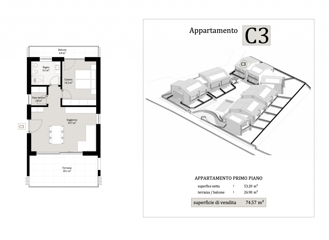 Gli appartamenti bilocali di 64 mq, in classe energetica A4, offrono spazi generosi, finiture di qualità e un’elevata efficienza energetica.